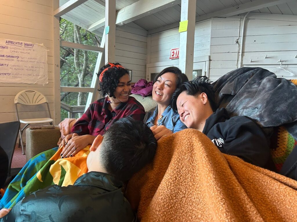 Four participants of the 2024 Asian Diaspora jam are cuddled and laughing together, three of them under a blanket and the fourth leaning on them.