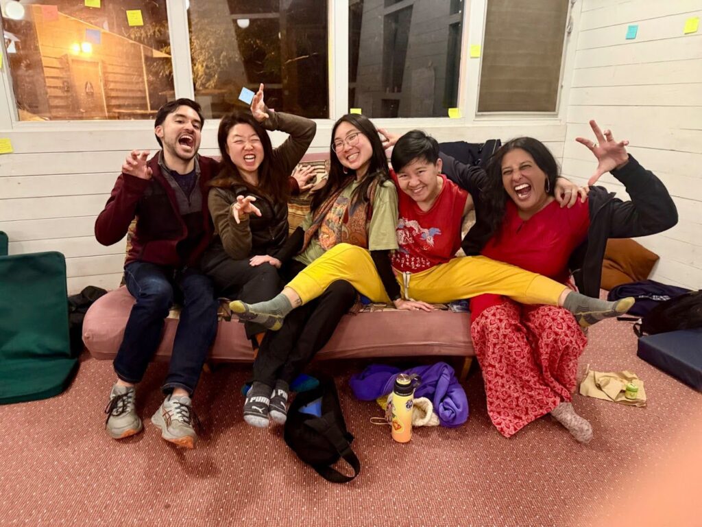 Five participants of the 2025 Asian Diaspora jam are squeezed together on a couch, laughing and roaring like dragons.