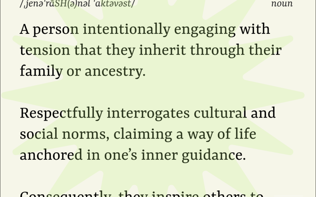 A person intentionally engaging with tension that they inherit through their family or ancestry. Respectfully interrogates cultural and social norms, claiming a way of life anchored in one’s inner guidance. Consequently, they inspire others to pave their own unique paths.
