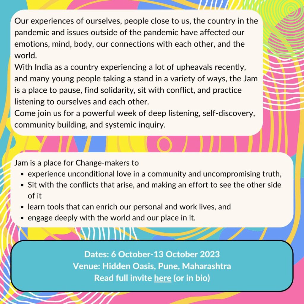 India Youth Jam 2023Aug 15, 2023 India Youth Jam 2023 by 1049 1049 people viewed this event. Click here to read the full invite Click here to read the full invite Register for event To register for this event please visit the following URL: https://docs.google.com/forms/d/e/1FAIpQLSd3QBKb7rYbMoS2nMtFSOR8oyvBS5CgPOI2Uk8c3RHawUrgtQ/viewform → Date And Time 2023-10-06 to 2023-10-13 Location Hidden Oasis, Pune, Maharashtra Event CategorySector based jamsShare With Friends Facebook Twitter Linkedin Xing Pinterest