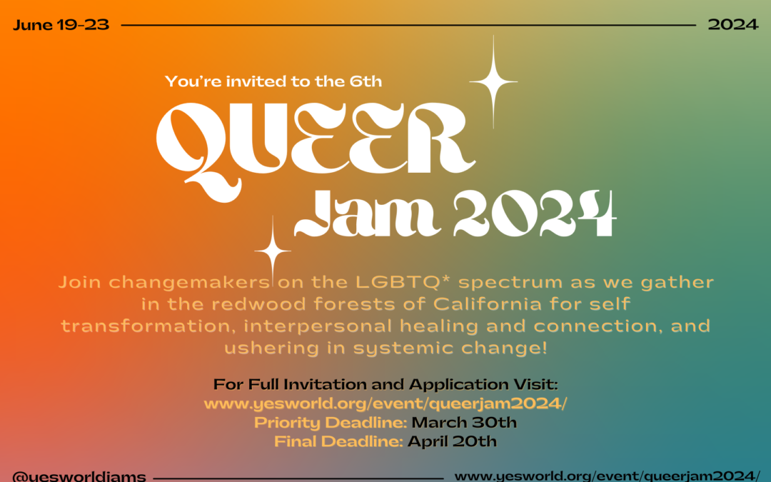 The in-person Queer Jam will take place at the Ahimsa Collective Healing & Justice Center in the redwood forest near Santa Cruz, CA, from Wednesday, June 19th until Sunday, June 23rd, 2024.