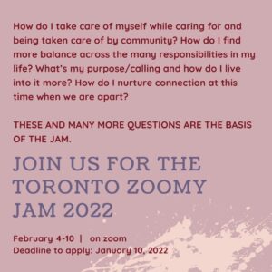 This is the second time we’re doing an online Toronto Jam — the first was in April 2021 as a response to our ongoing pandemic reality. So much of the beauty and power of Jams in years past has been the sharing of physical space together and still, we felt that given the ongoing challenges of the pandemic, meeting virtually feels like a vital and exciting opportunity to keep connecting and collaborating together. We also found that gathering virtually made Jam-ing more accessible for some folks, which was a profound realization. So! We’re doing it again. (We hope to Jam in person again soon but do not have dates set at this time.)