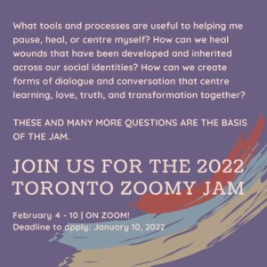 Given that we’re doing this year’s Jam online, we’re open to applicants from neighbouring Toronto areas or who otherwise have or feel some kind of connection to Toronto and to transformation work.