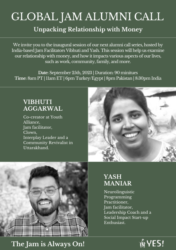 Yash and Vibhuti have designed a beautiful call on exploring our relationship to money. Definitely a stretchy, yet deeply important topic! We hope to see you there! Please register using the link above.
