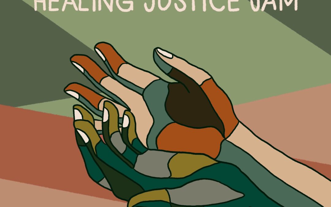 Image description for accessibility: a graphic of two outstretched hands, palms up, in various shades of brown, green, orange, and blue accompanied by the words “save the date: Wellness & Healing Justice Jam, August 23-27, 2022, Watershed Center, NY”
